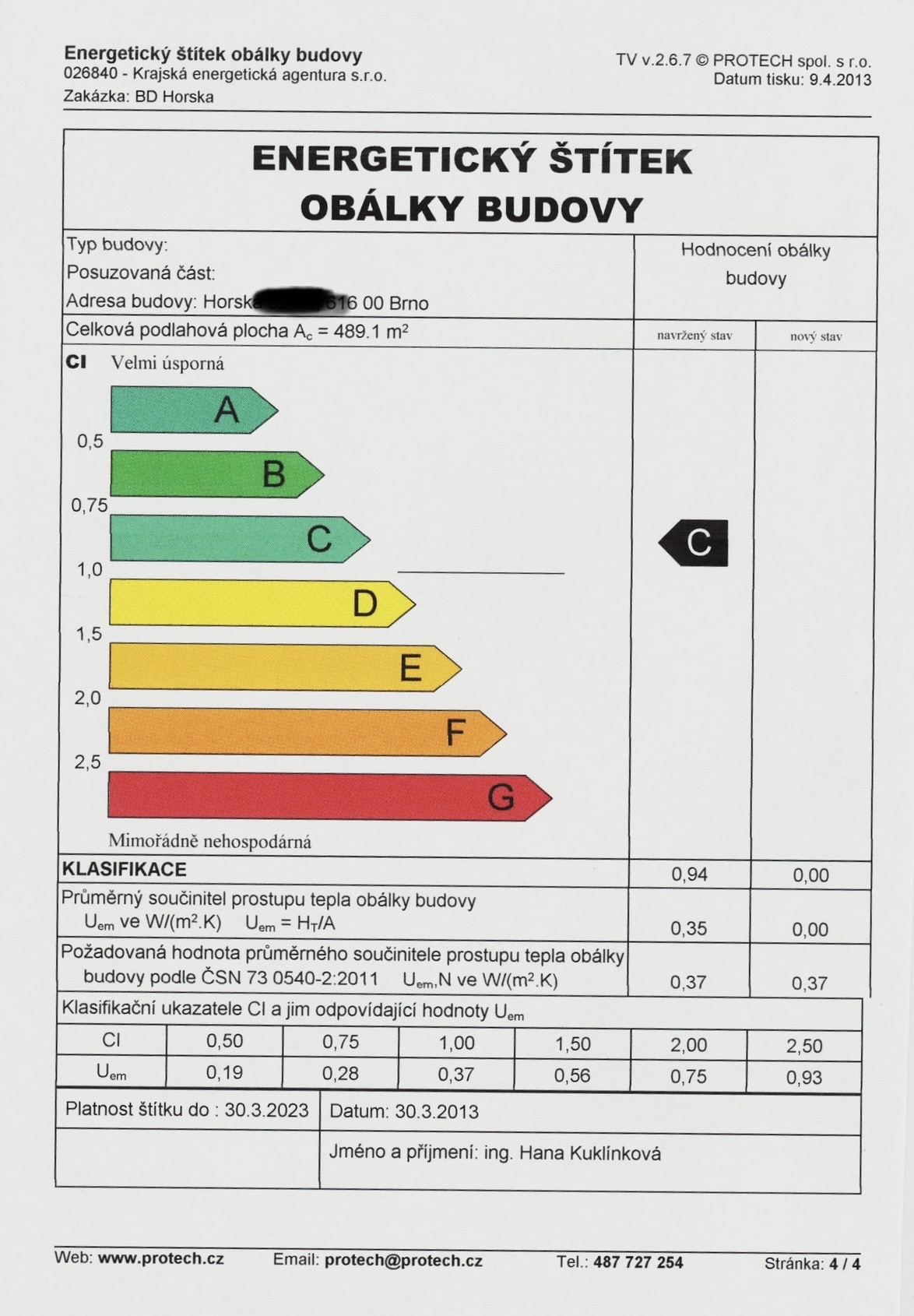 | Ukazatel ENB | 0.94 kWh/m2 za rok |